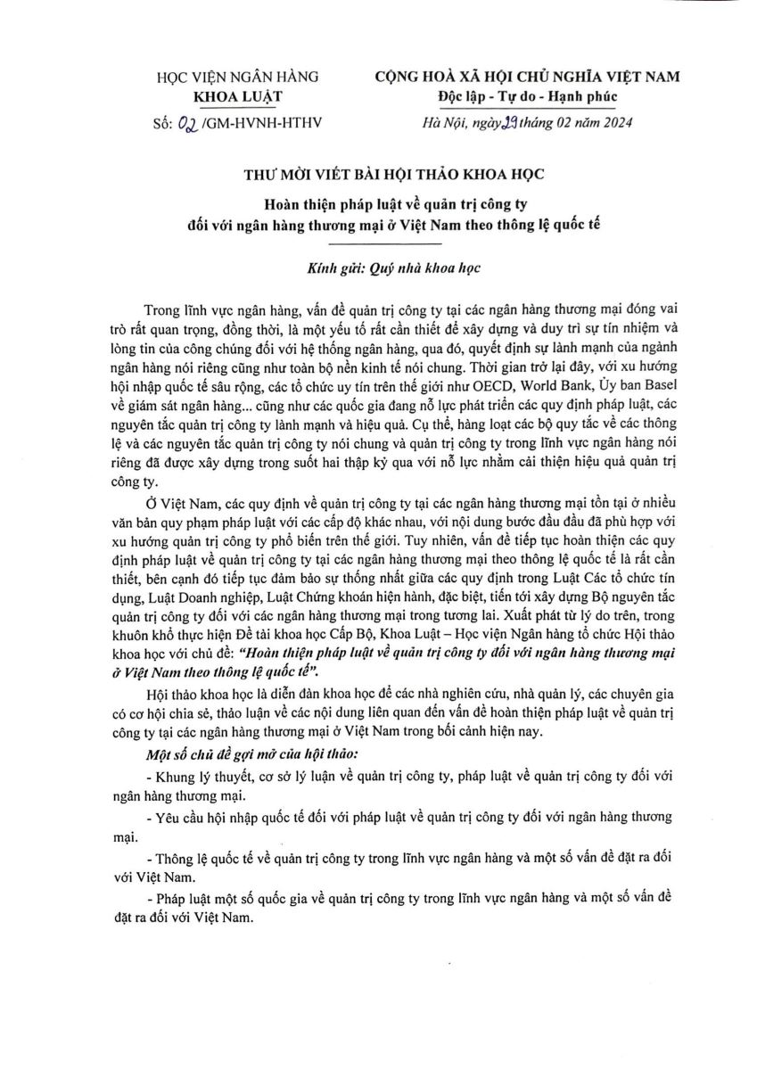 📌 Mạng lưới các cơ sở đào tạo Luật tại Việt Nam (VLSN) kính thông tin đến các Quý Thầy/Cô đại diện các đơn vị thành viên của Mạng lưới các cơ sở đào tạo Luật ở Việt Nam, nghiên cứu sinh, học viên cao học có quan tâm đến Hội thảo khoa học với chủ đề “Hoàn thiện pháp luật về quản trị công ty đối với ngân hàng thương mại ở Việt Nam theo thông lệ quốc tế” Khoa Luật - Học viện Ngân hàng tổ chức.