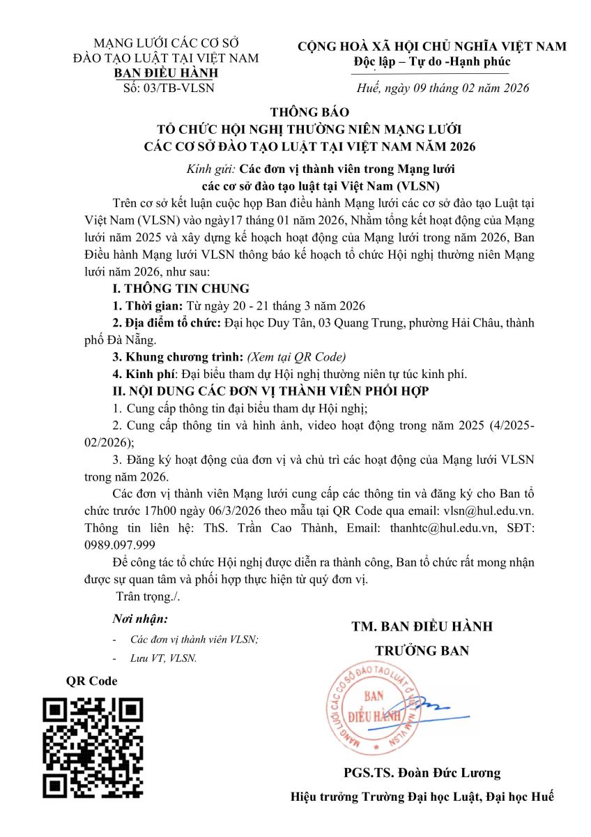 THÔNG BÁO TỔ CHỨC HỘI NGHỊ THƯỜNG NIÊN MẠNG LƯỚI CÁC CƠ SỞ ĐÀO TẠO LUẬT TẠI VIỆT NAM NĂM 2026